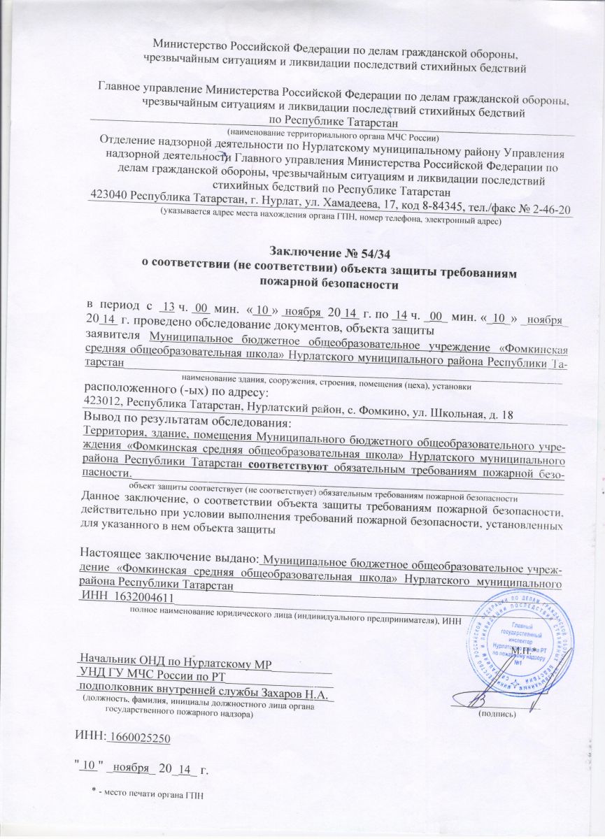 - Заключение о соответствии объекта защиты требованиям пожарной безопасности / Объектны яклау, янгын куркынычсызлыгы таләпләренә туры килүче бәяләмә