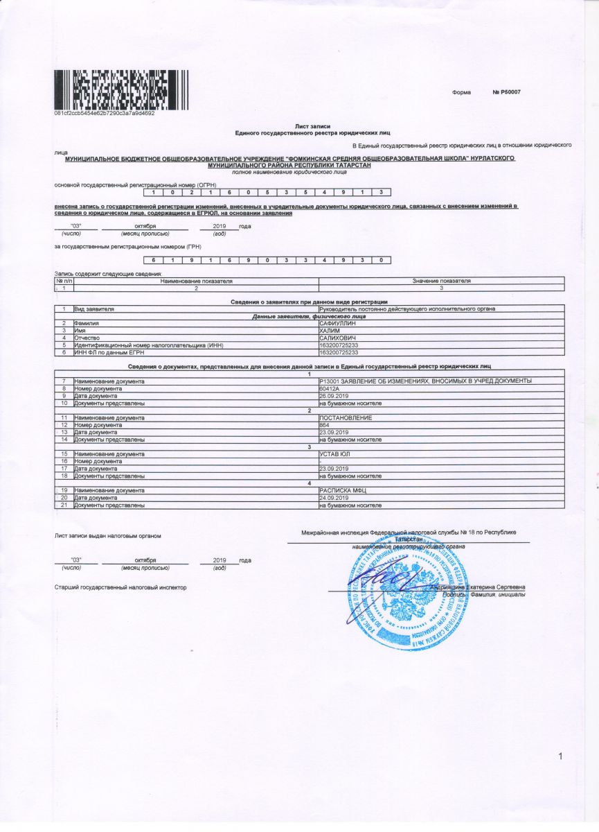- Лист записи Единого государственного реестра юридических лиц от 03 октября 2019 года