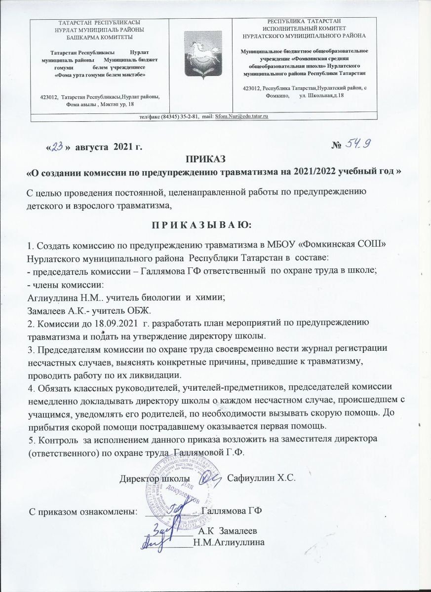 Приказ О создании комиссии по предупреждению травматизма на 2021-2022 учебный год.