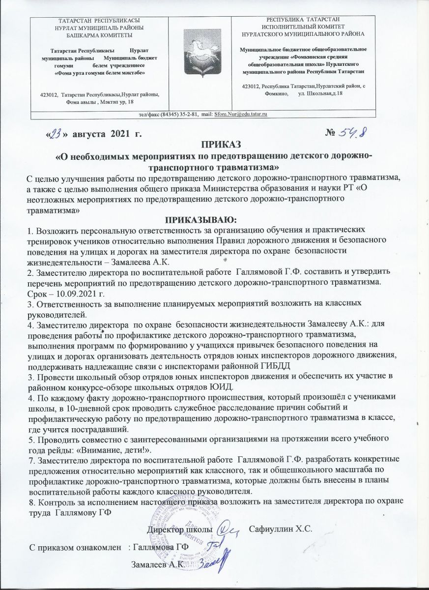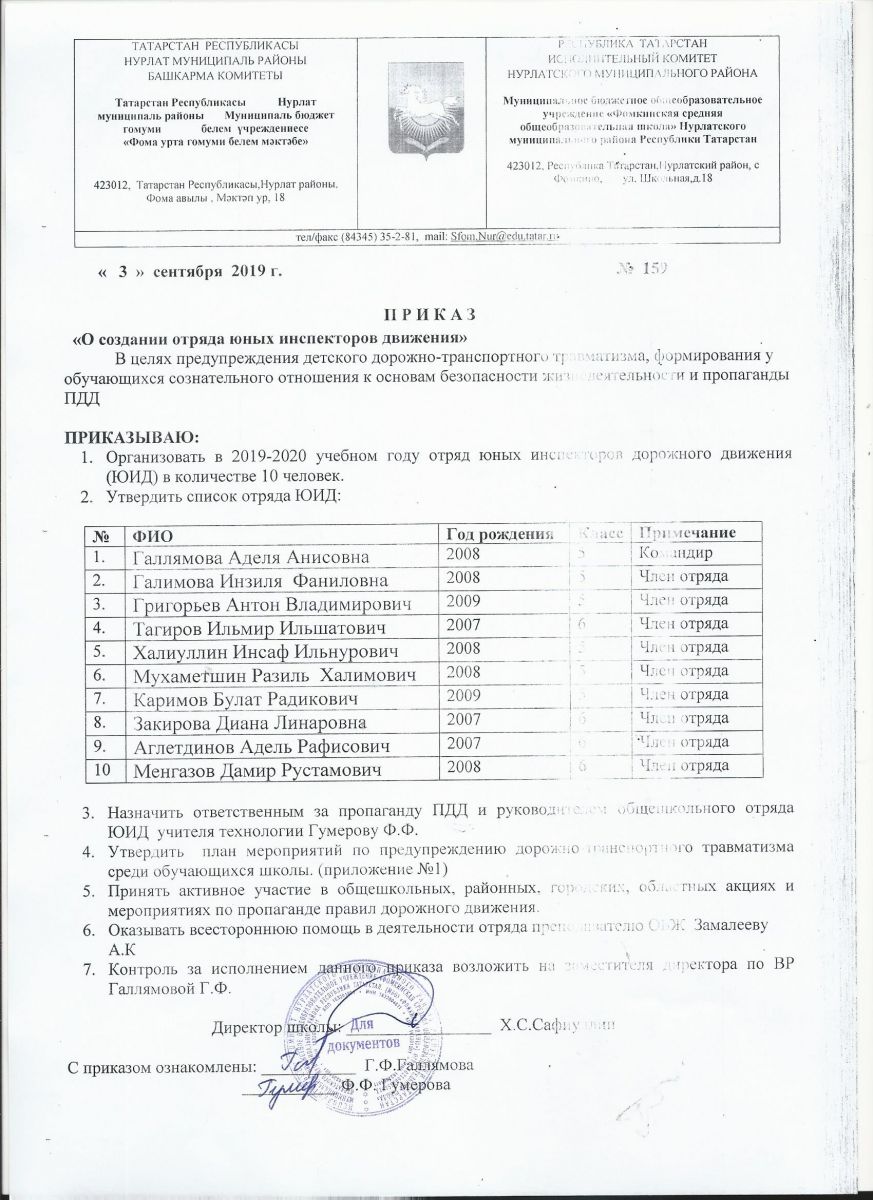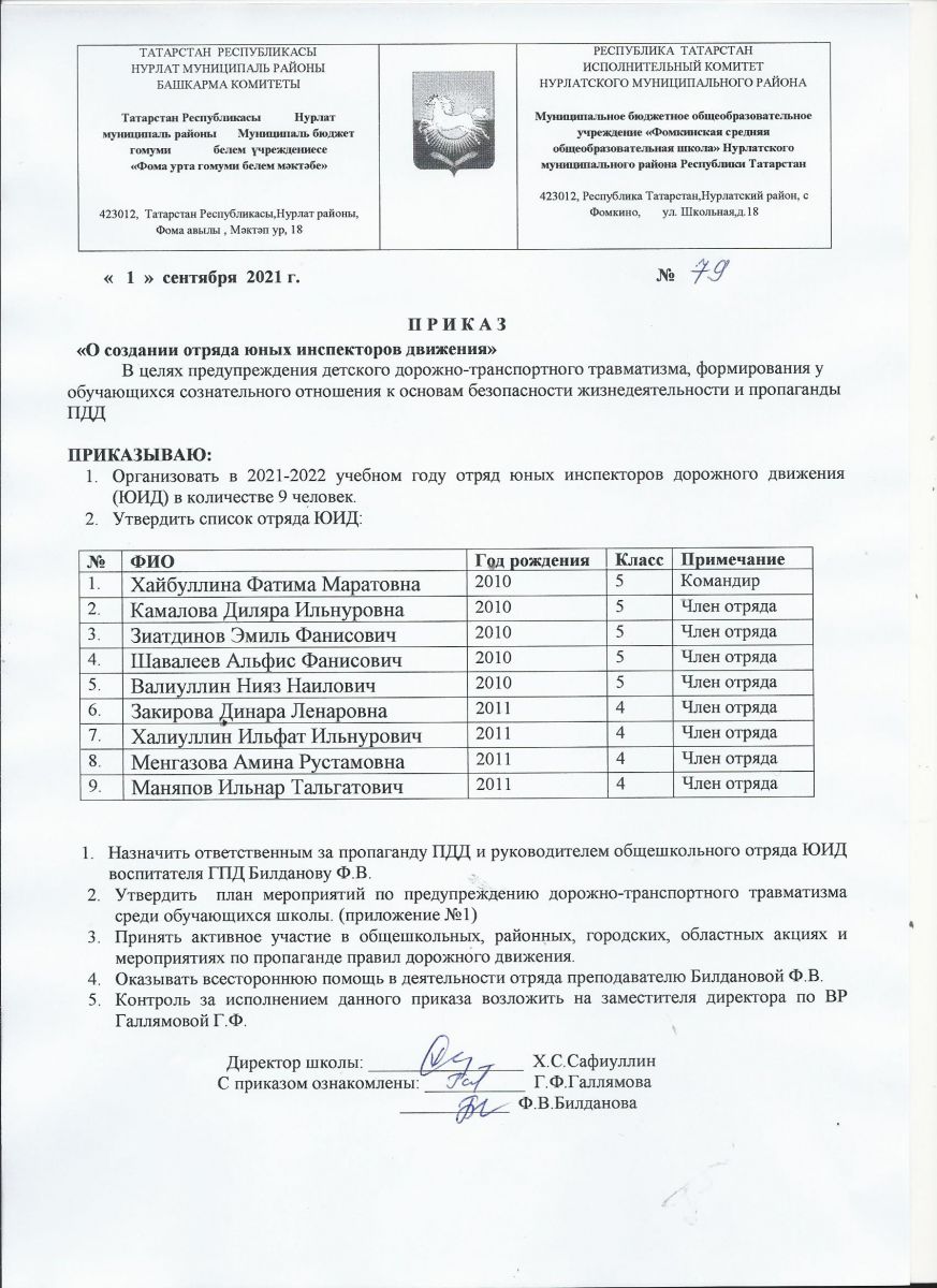Приказ О создании отряда Юных инспекторов движения (ЮИД) на 2021-2022 уч.год