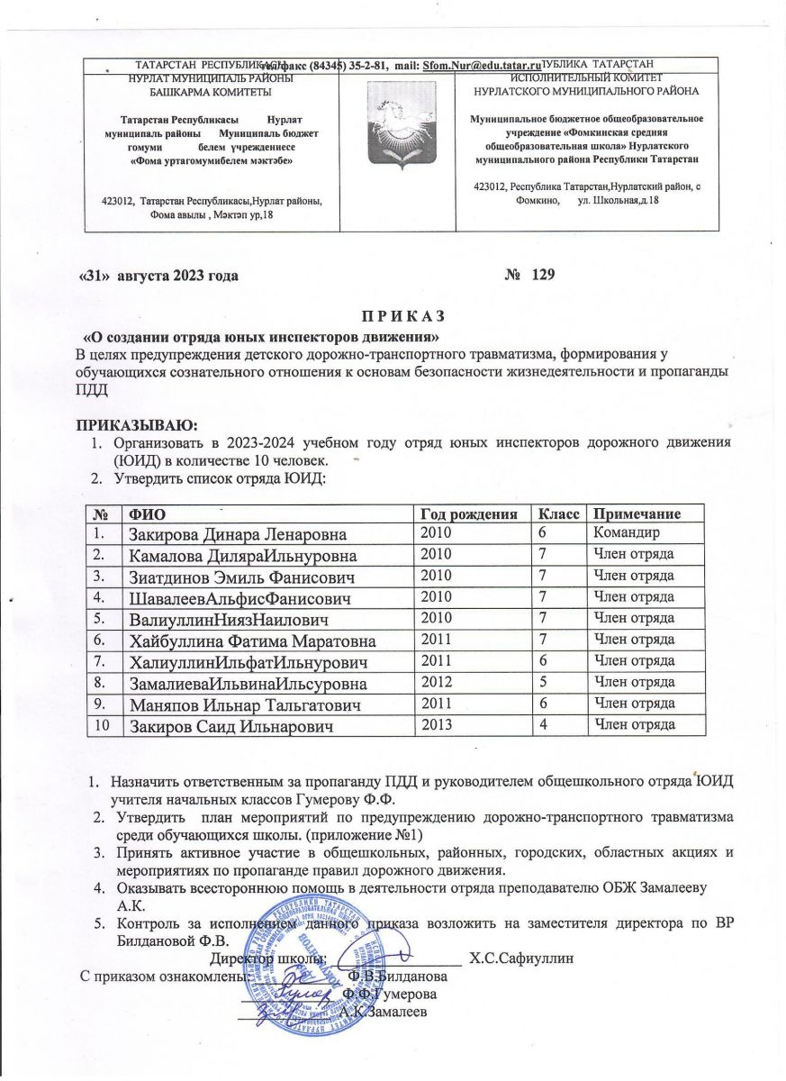 Приказ №129 ОТ 31.09.2023 г "о создании отряда ЮИД"