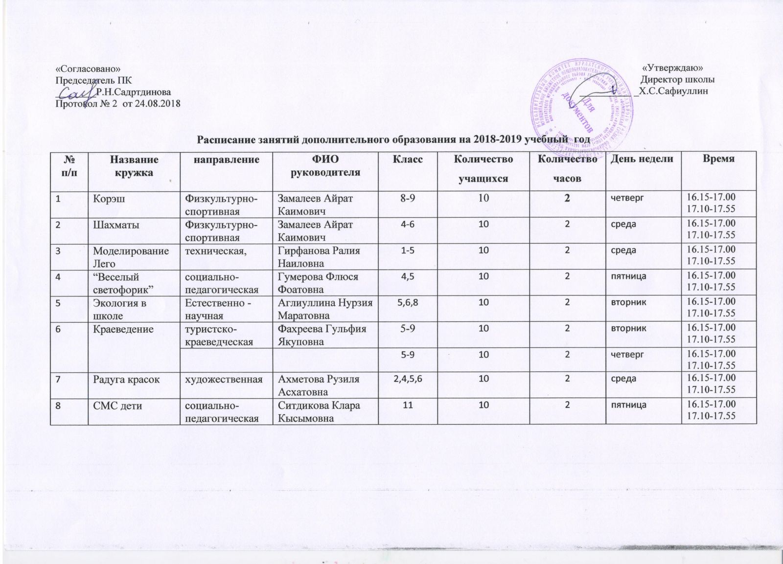 - Расписание кружков на 2018 – 2019 учебный год / 2018 – 2019 уку елына түгәрәклә раписаниясе