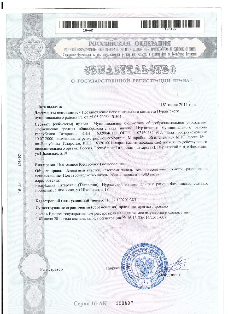 Свидетельство о государственной регистрации участка школы /Җир участогына дәүләт теркәве хокукы турында таныклык