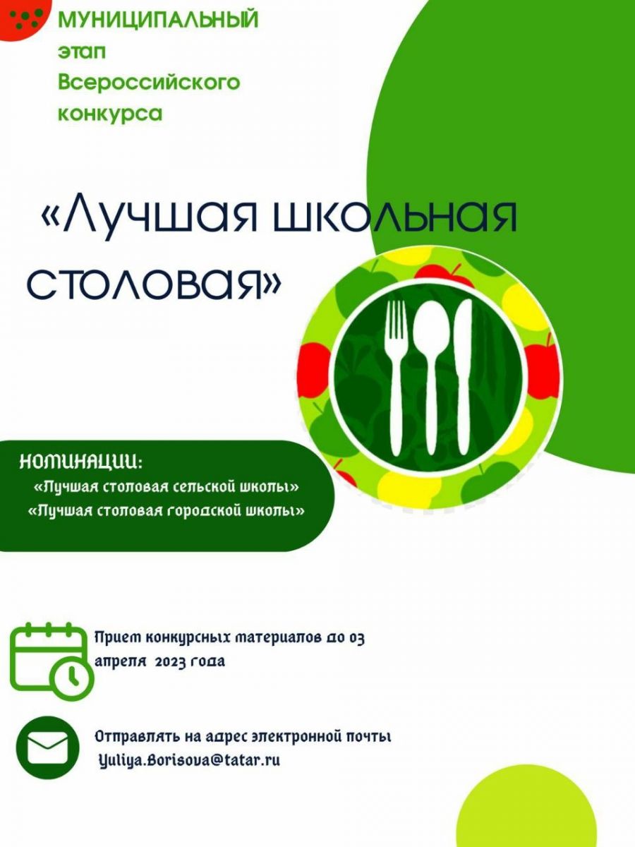 Уважаемые руководители общеобразовательных организаций и организаторы питания!22 марта 2023 года стартовал муниципальный этап Всероссийского конкурса «Лучшая школьная столовая». Конкурс проводится по двум номинациям: «Лучшая столовая городской школы» «Лучшая столовая сельской школы» Конкурсные материалы отправляются на адрес электронной почты Yuliya.Borisova@tatar.ru