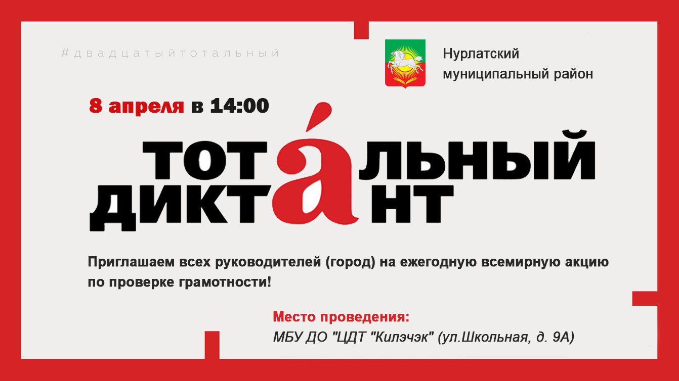 Приглашаем поучаствовать на ежегодной всемирной акции по проверке грамотности, которая состоится 08 апреля 2023г. в 14.00 часов на базе МБУ ДО "Центр детского творчества "Килэчэк" (ул.Школьная, д. 9а) -