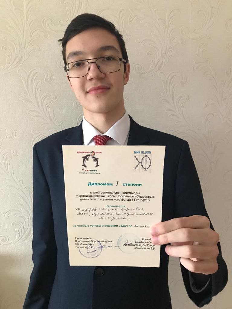 В г.Альметьевск проводилась малая региональная олимпиада участников Зимней школы Программы "Одарённые дети" Благотворительного фонда "Татнефть". Наши юноши Нурлатской гимназии Федоров Савелий (учитель: Мазилкина Л.П.) и Хамадиев Саид (учитель: Гилязева Л.Н.) побывали на недельных курсах по подготовке к Республиканскому этапу олимпиад по физике и математике и приехали с прекрасными результатами!!! Молодцы!Поздравляем.
