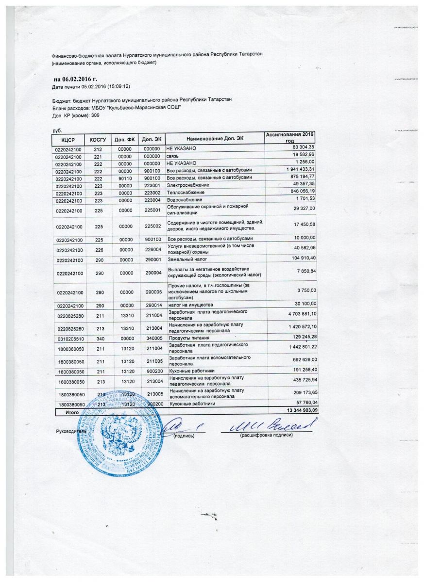 Бюджет МБОУ "Кульбаево-Марасинская СОШ" на 2016 год