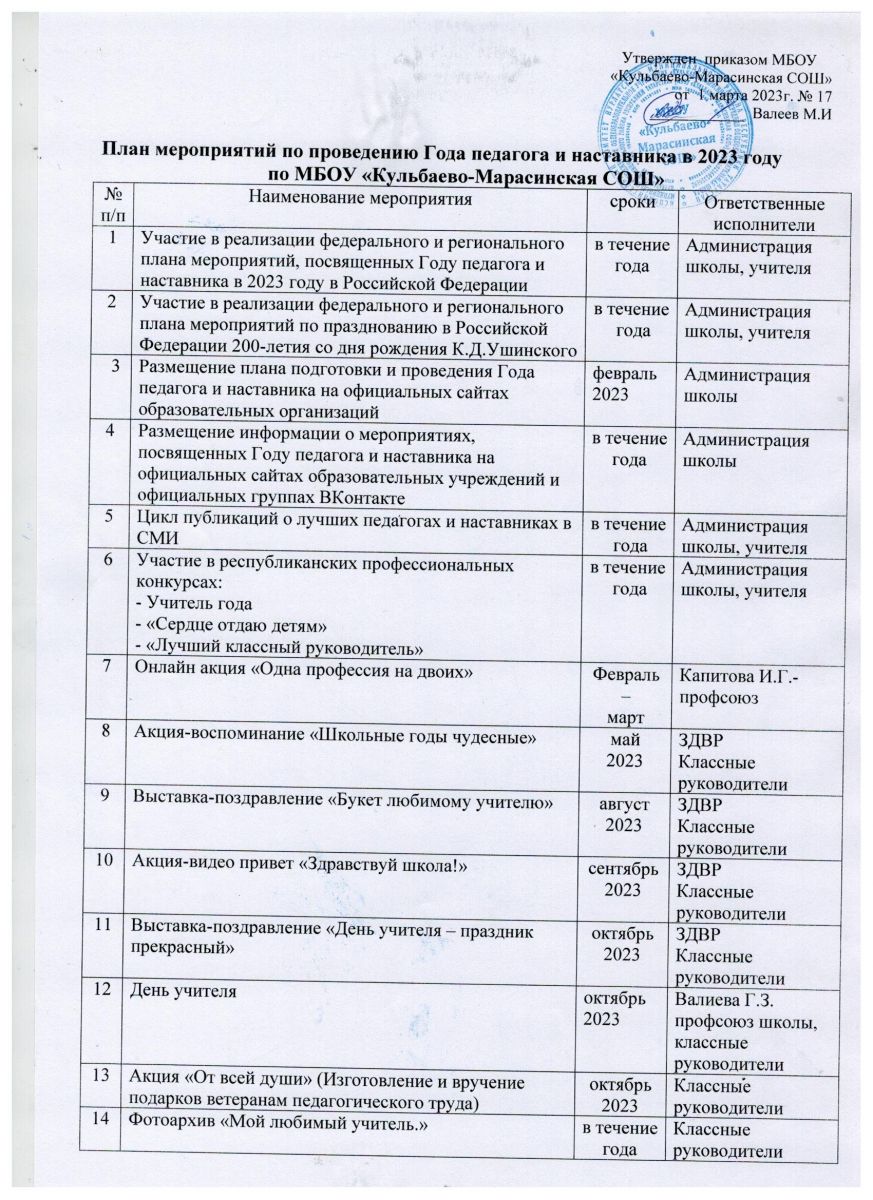 План мероприятий по проведению Года педагога и наставника по МБОУ "Кульбаево-Марасинская СОШ"