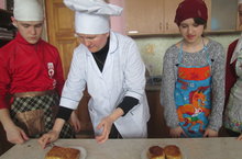Сурәттә Фәйзуллин М.Я. пешекче булырга теләүчеләр белән кухняда.