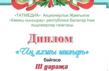 "Алмаш" ТВБ балалар оешмасы рәисе, мәктәбебез укучысы Колмөхәммәтов З.И. "ТАТМЕДИА" АҖ тарафыннан уздырылган "Иң яхшы шигырь" бәйгесендә IIII дәрәҗәдәге дипломга лаек булды.Афәрин! Котлыйбыз, җиңүчегә киләчәктә дә иҗади уңышлар телибез.