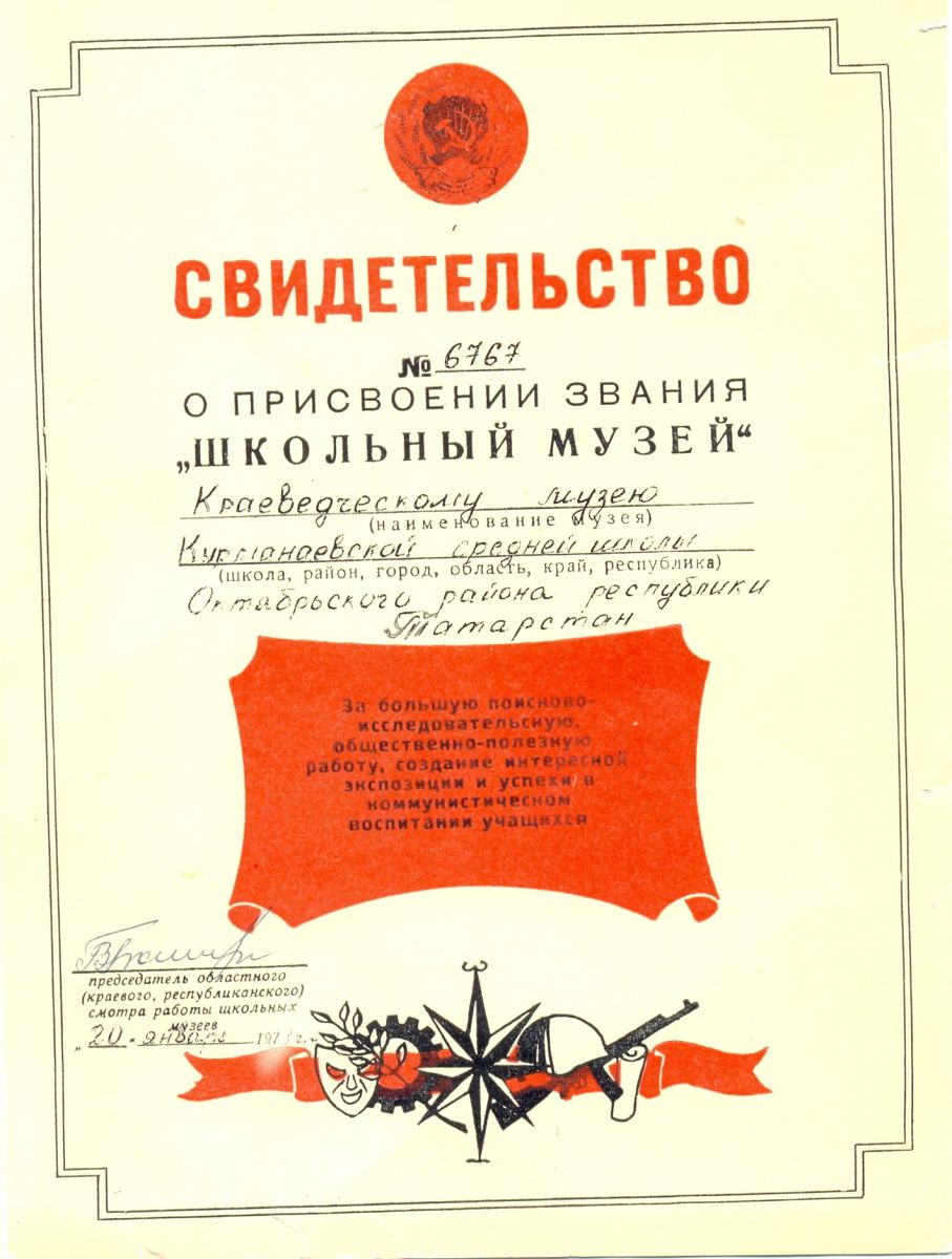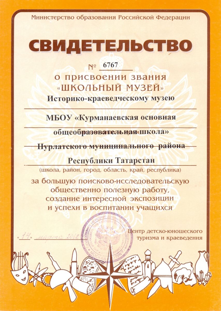 Свидетельство о присвоении звания Школьный музей.jpg/Мәктәп музее исемен бирү турында таныклык