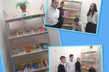 Учитель обществознания Калимуллина Флюра Исмагиловна с учащимися 11 кл. у книжной выставки "Правовые знания" в читальном зале./Җәмгыять белеме укытучысы Кәлимуллина Флюра Исмәгыйль кызы 11 сыйныф укучылары белән "Хокукый белемнәр" китап күргәзмәсе янында уку залында.