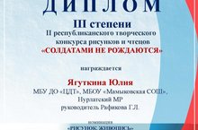 Ягуткина Юлия участвовала в II Республиканском конкурс рисунков "Солдатами не рождаются" посвященного 75- летию Победы в Великой Отечественной войне и заняла III место. Поздравляем!!!