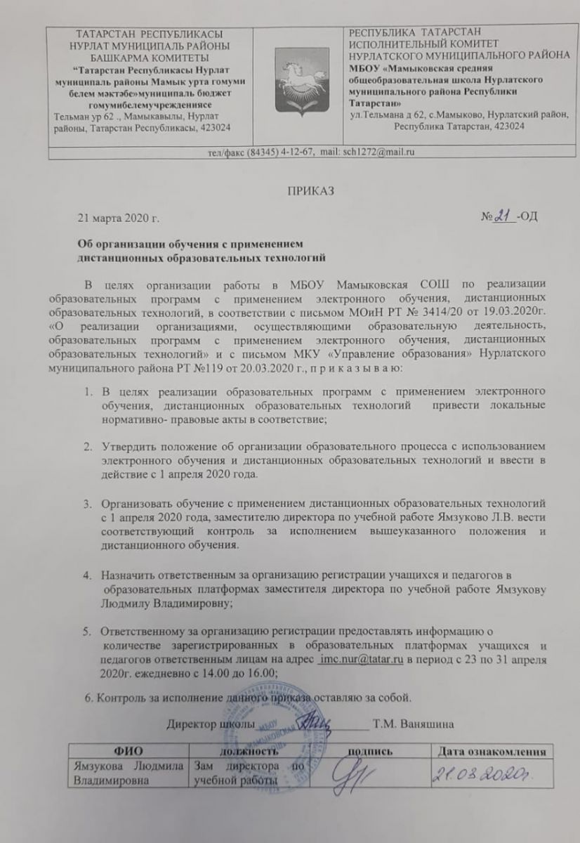 Методическое письмо МОиН РТ № 3414/20 от 19.03.2020 "О реализации организациями,осуществляющими образовательную деятельность, образовательных программ с применением электронного обучения, дистанционных образовательных технологий"