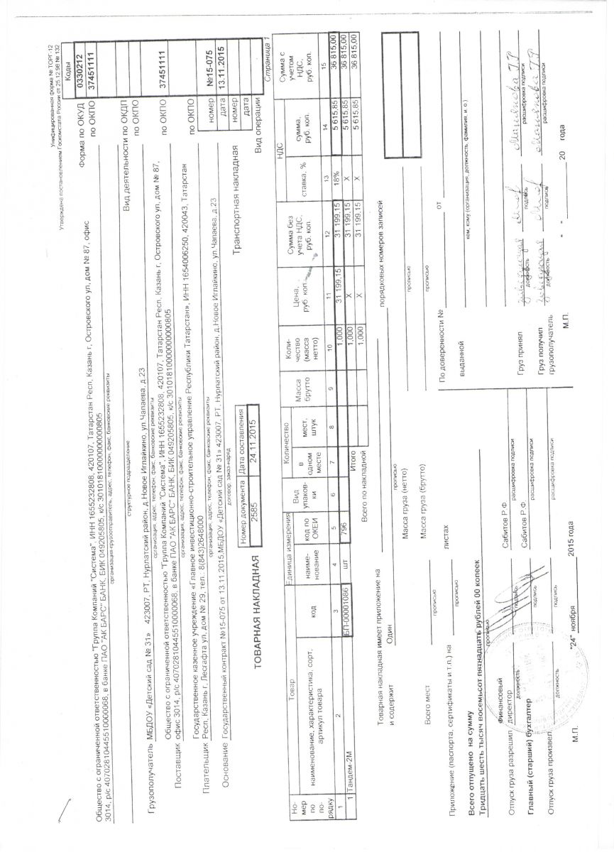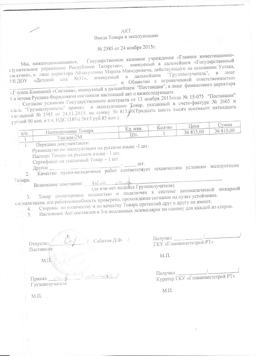 Акт ввода в эксплуатацию автоматической пожарной сигнализации "Тандем-2М" (товарная накладная)/"Тандем-2М" автоматик янгын сүндерү сигнализациясен куллануга тапшыру акты