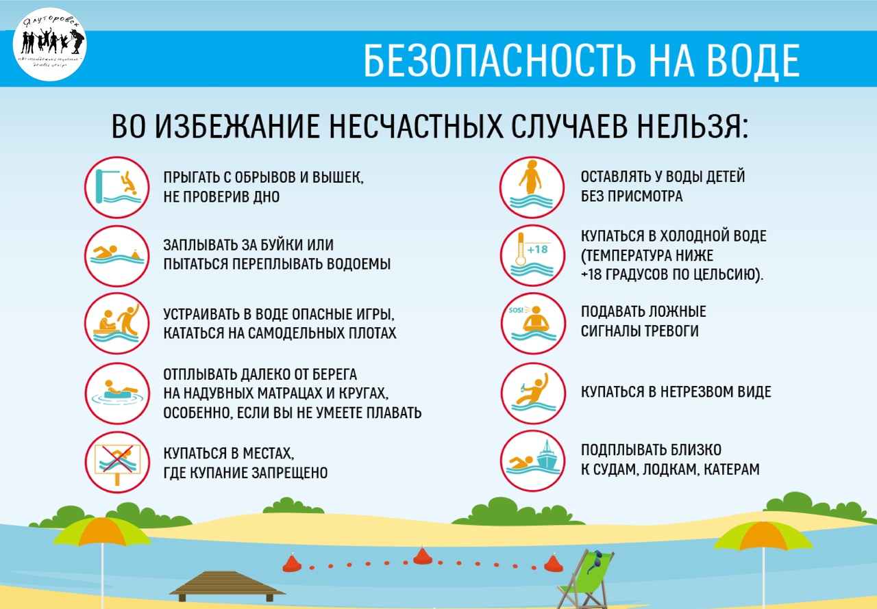 Не допускайте купания детей в неустановленных местах с непроверенным дном, не позволяйте детям купаться в воде, температура которой ниже 16 °С. Старайтесь купаться не ранее чем через полтора часа после еды. В жаркий день после долгого нахождения под солнцем резкое погружение в холодную воду может вызвать потерю сознания и даже остановку сердца. Контролируйте, чтобы дети вначале споласкивались водой, а уже затем погружались в неё.