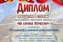 В январе 2022 года Зарина Хусаинова, ученица 2в класса (Краснова О.П., классный руководитель) МАОУ "Нурлатская гимназия им. М.Е. Сергеева" г.Нурлат приняла участие во Всероссийском творческом конкурсе «На службе Отечеству». Она награждена Дипломом победителя I степени. Поздравляем!