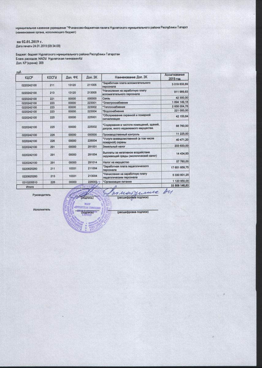 Бюджет МАОУ Нурлатская гимназия на 02.01.2019