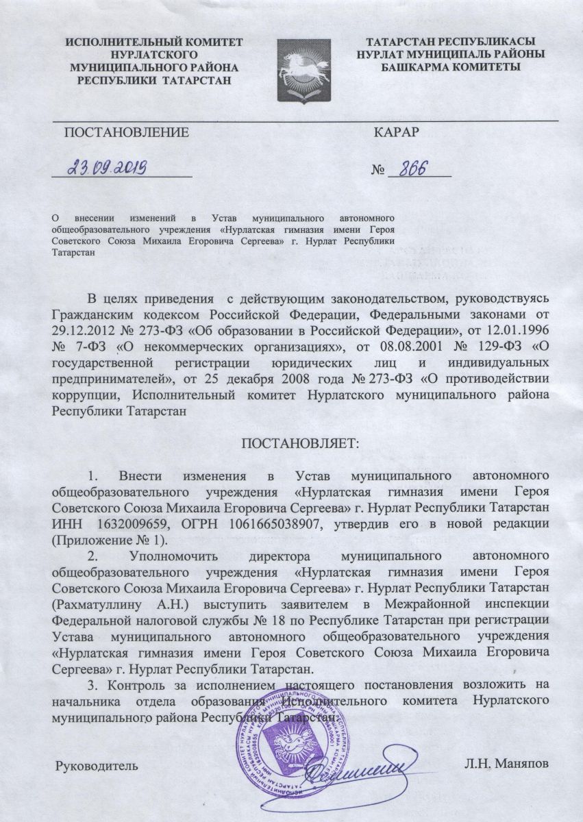 Постановление об изменении Устава Нурлатской гимназии (23.09.2019)