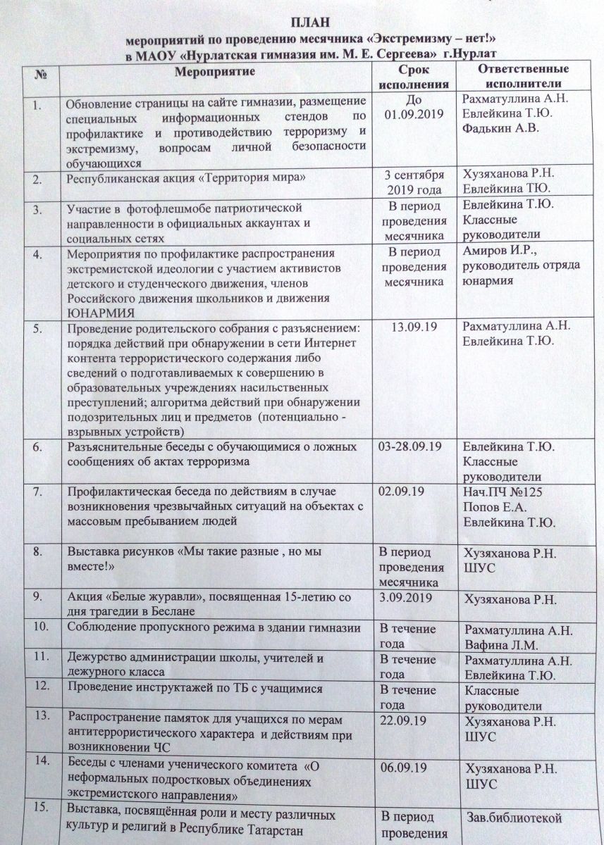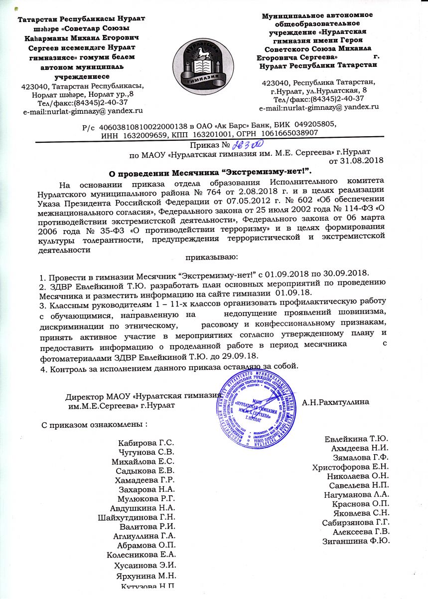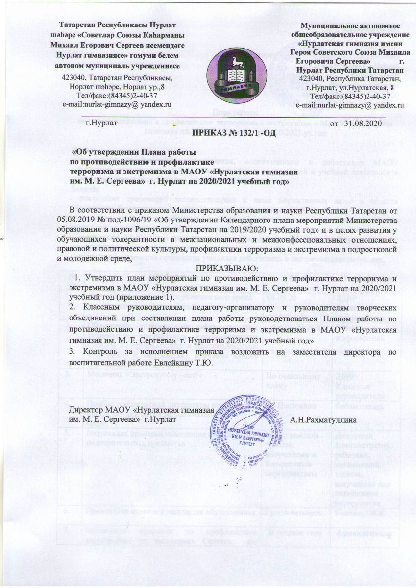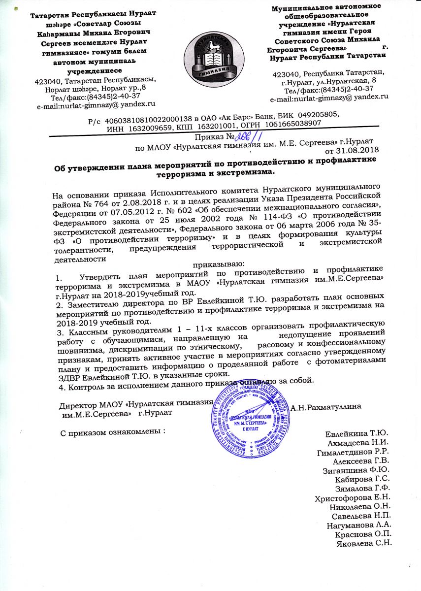 Приказ об утверждении плана меропритий по противодействию и профилактике терроризма и экстремизма в МАОУ "Нурлатская гимназия им.М.Е.Сергеева"