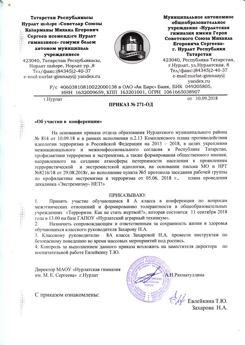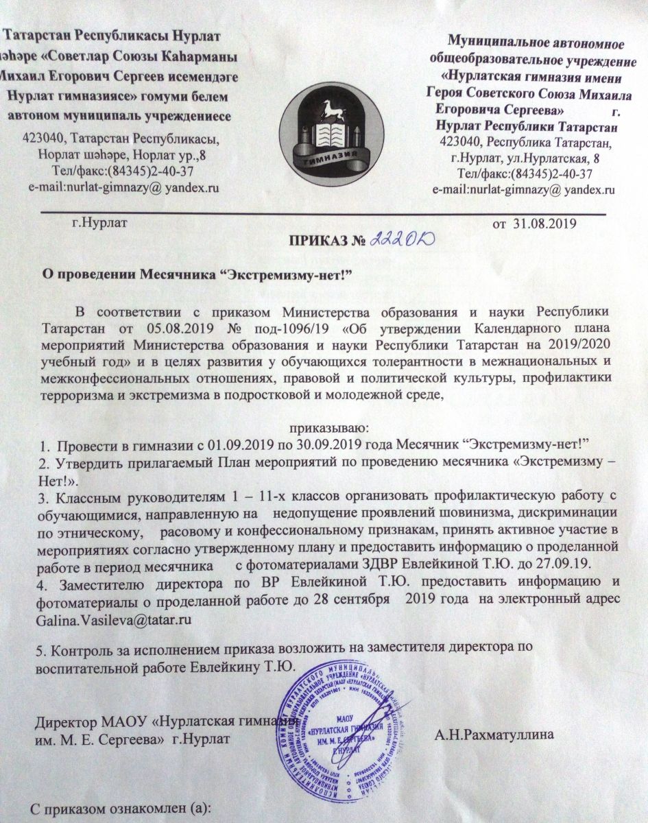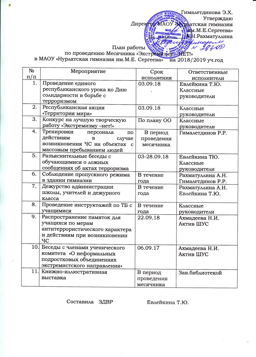 Приказ об утверждении плана меропритий по противодействию и профилактике терроризма и экстремизма в МАОУ "Нурлатская гимназия им.М.Е.Сергеева"