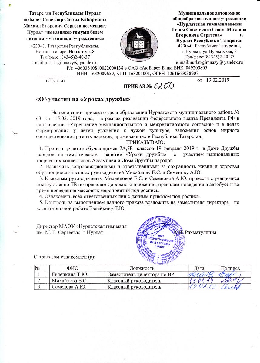 Приказ о участии на "Уроках дружбы" 19.02.2019