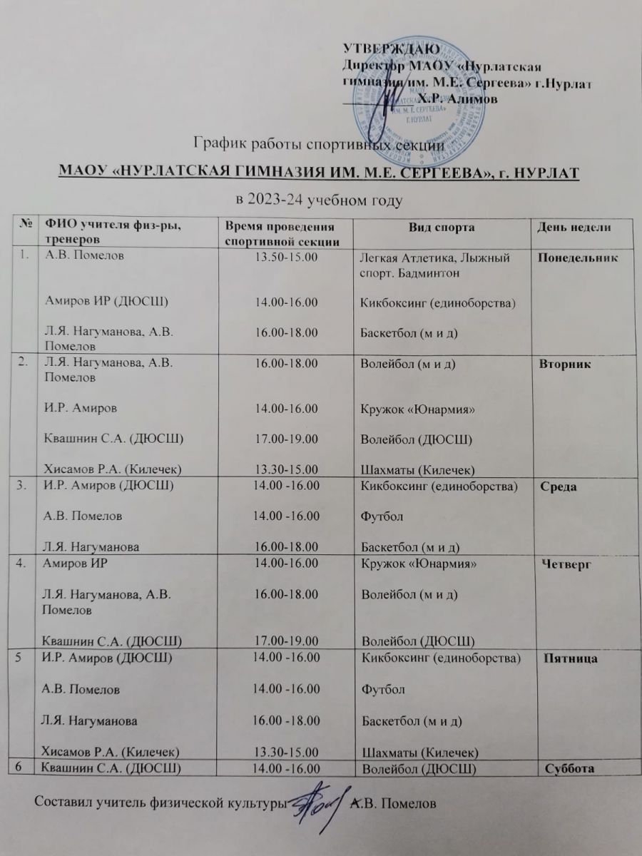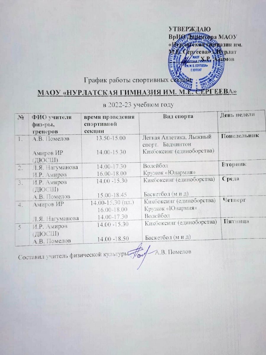 График работы спортивный секций