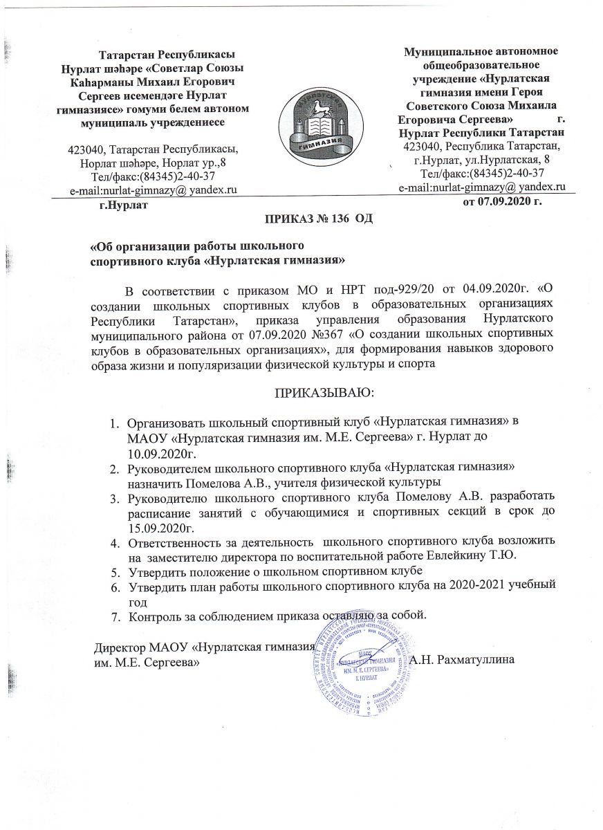 Приказ №-136ОД от 07.09.2020г "О создании школьного спортивного клуба
