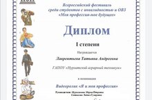 Поздравляем Лаврентьеву Татьяну, обучающуюся 117 группы, и ее руководителей- Мурзаханову М.П. и Сотникову Э.Г. с победой в номинации «Видеоролик «Я и моя профессия»» в рамках Всероссийского фестиваля среди студентов с инвалидностью и ОВЗ «Моя профессия – мое будущее». -