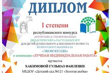 Поздравляем Хакимову Гульназ Фаилевну. Она удостоилась диплома 1 степени в республиканском конкурсе авторских и стилизованных дидактических и настольных игр для детей дошкольного возраста из бросового материала "ЭКОФЭНТАЗИ" в номинации "Лучшая индивидуальная работа".