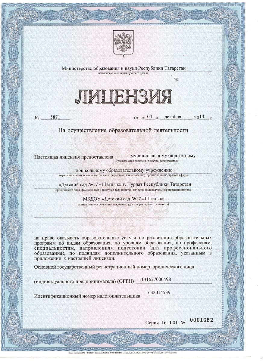 Лицензия на осуществлении образовательной деятельности 04.12.2014 год.