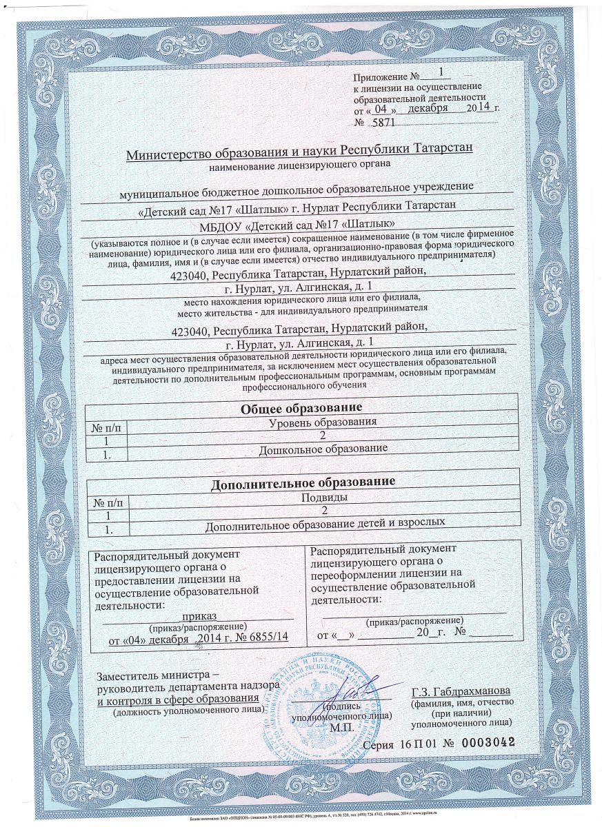 Приложение к лицензии на осуществлении образовательной деятельности 04.12.2014 г