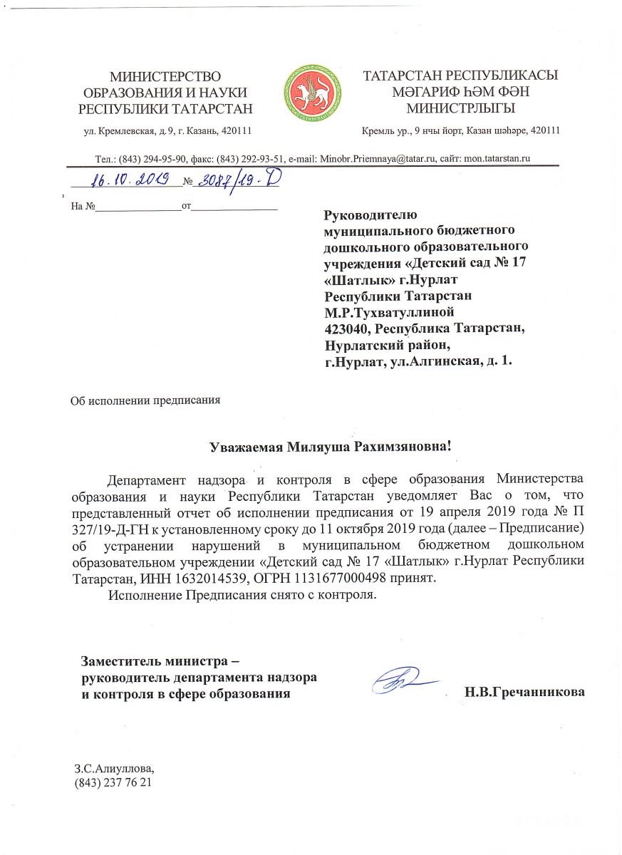 Предписание Департамента надзора и контроля в сфере образования об устранении нарушений / Мәгариф өлкәсендә күзәтчелек һәм контроль департаментының бозуларны бетерү турында кануны