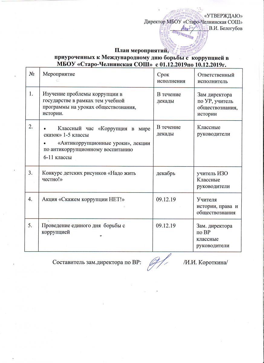 План мероприятий антикоррупционного воспитания в МБОУ "Старо-Челнинская СОШ"