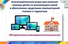 В рамках организации дистанционной формы обучения Министерством образования и науки Республики Татарстан (далее – Министерство) инициирована благотворительная акция для оказания помощи детям из малоимущих семей в обеспечении средствами компьютерной техники и гаджетами (#отдайзапаснойгаджетвсвоюшколу). Таким образом, любой житель Республики Татарстан может оказать посильную помощь детям из малоимущих семей и принести в школу запасные (неиспользуемые) средства компьютерной техники и мобильные устройства для создания условий дистанционного обучения. -