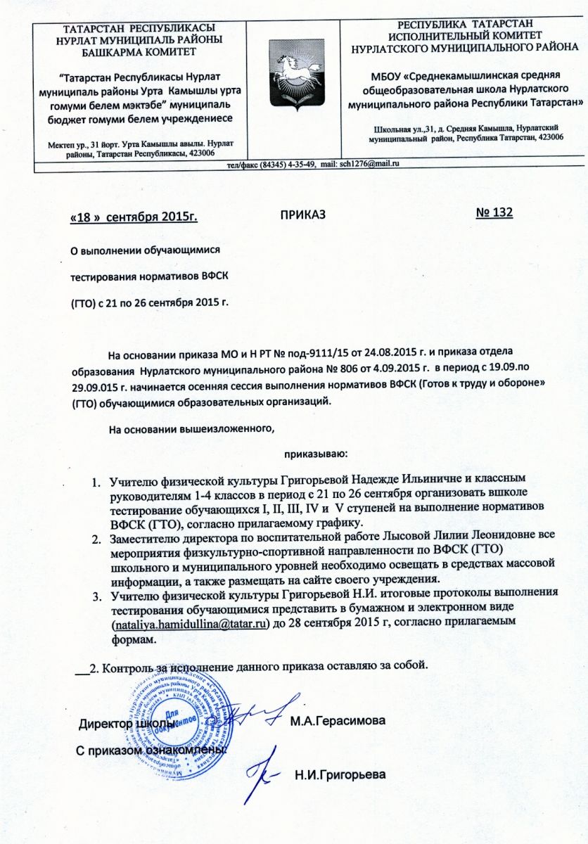 Приказ о реализации ВФСК ГТО в Среднекамышлинской СОШ
