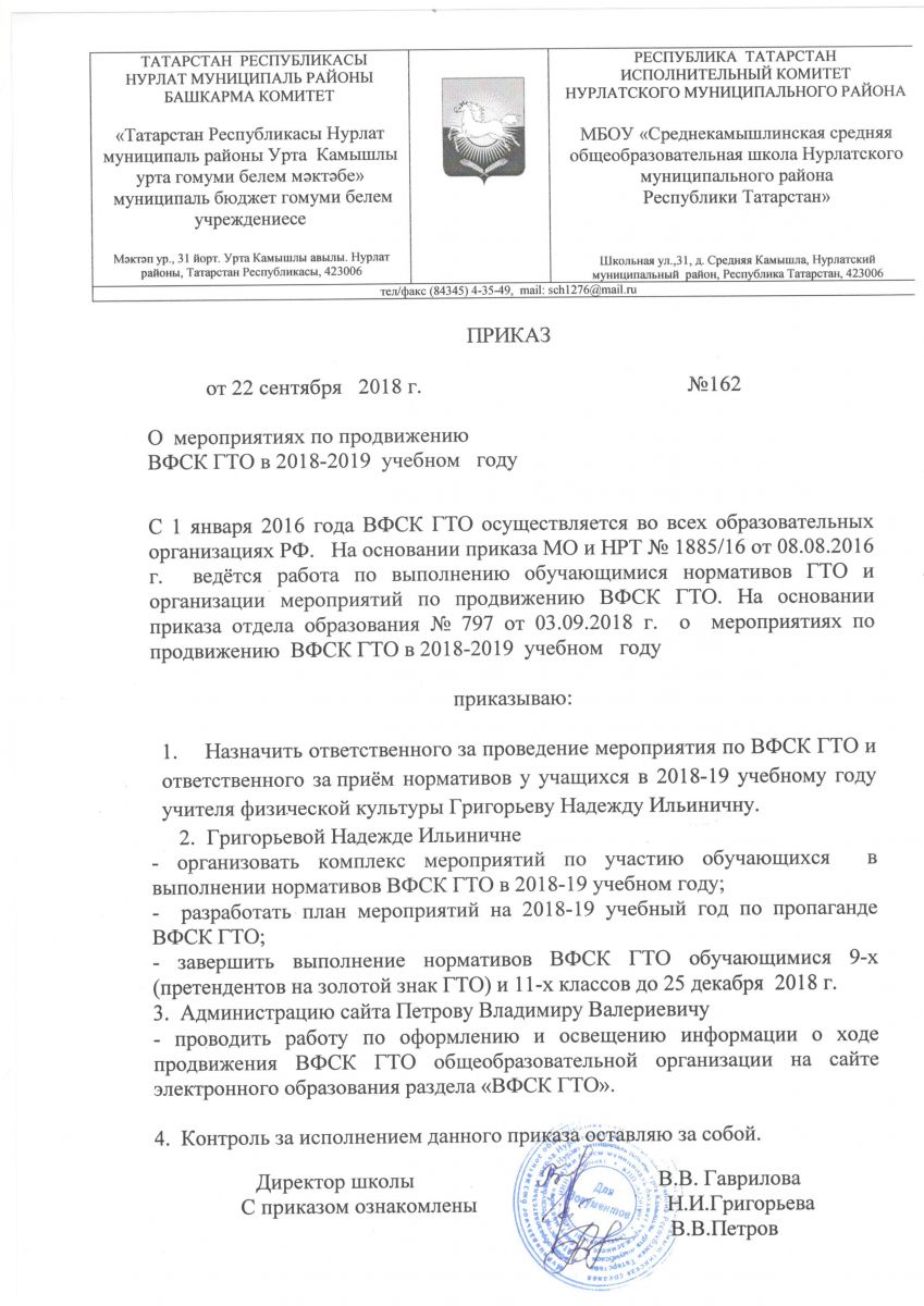 Приказ №162 от 22.09.2018 г. "О мероприятиях по продвижению ВФСК ГТО в 2018-2019 учебном году"