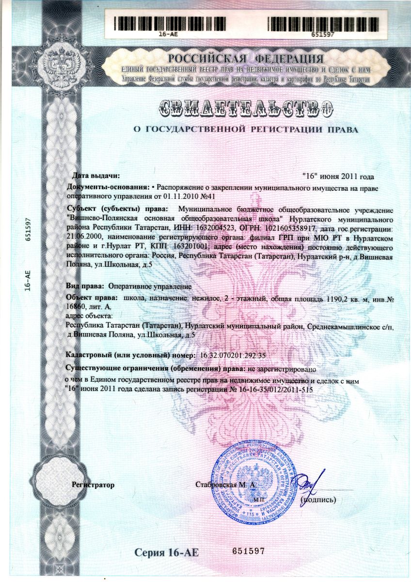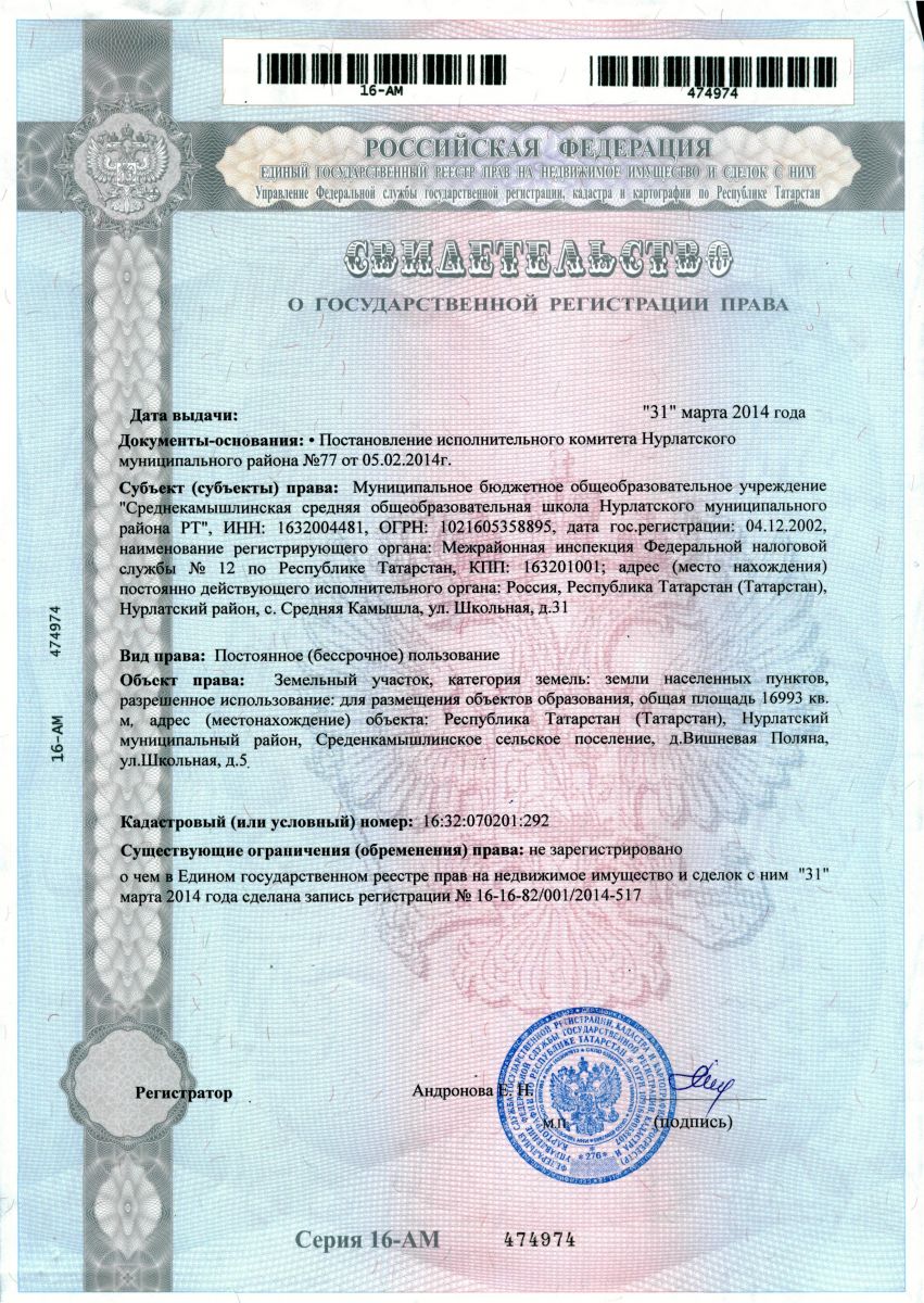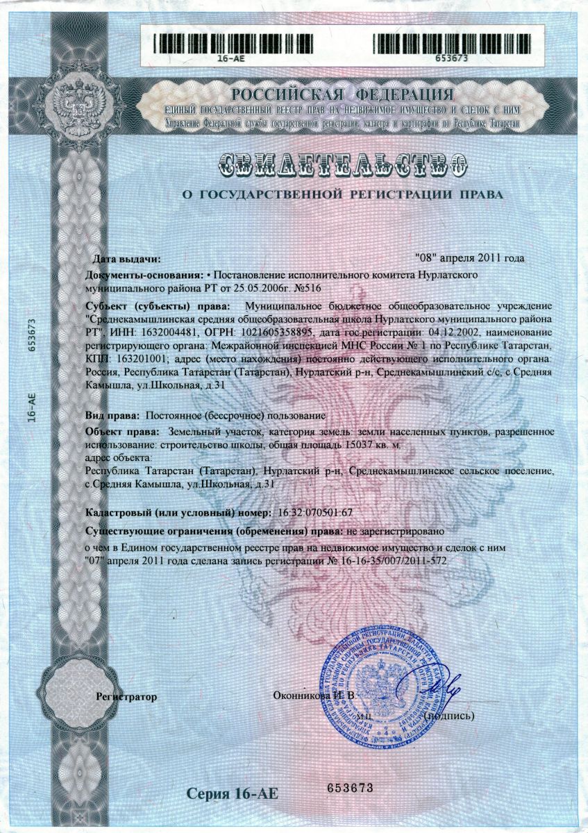 Свидетельство о государственной регистрации права на земельный участок (школа)
