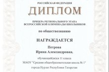 Поздравляем ученицу 11 класса Петрову Ирину, призера Республиканского этапа Всероссийской олимпиады школьников по обществознанию! Учитель Гилязова Ф.Ф.