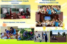 Сегодня воспитанники лагеря ходили в ГДК на кино "Никита Кожемяка" и в лагере тоже смтрели фильм "Судьба человека". Затем много играли: соревновались в шахматах и шашках, играли в вышибалы и вспомнили дворовые игры.
