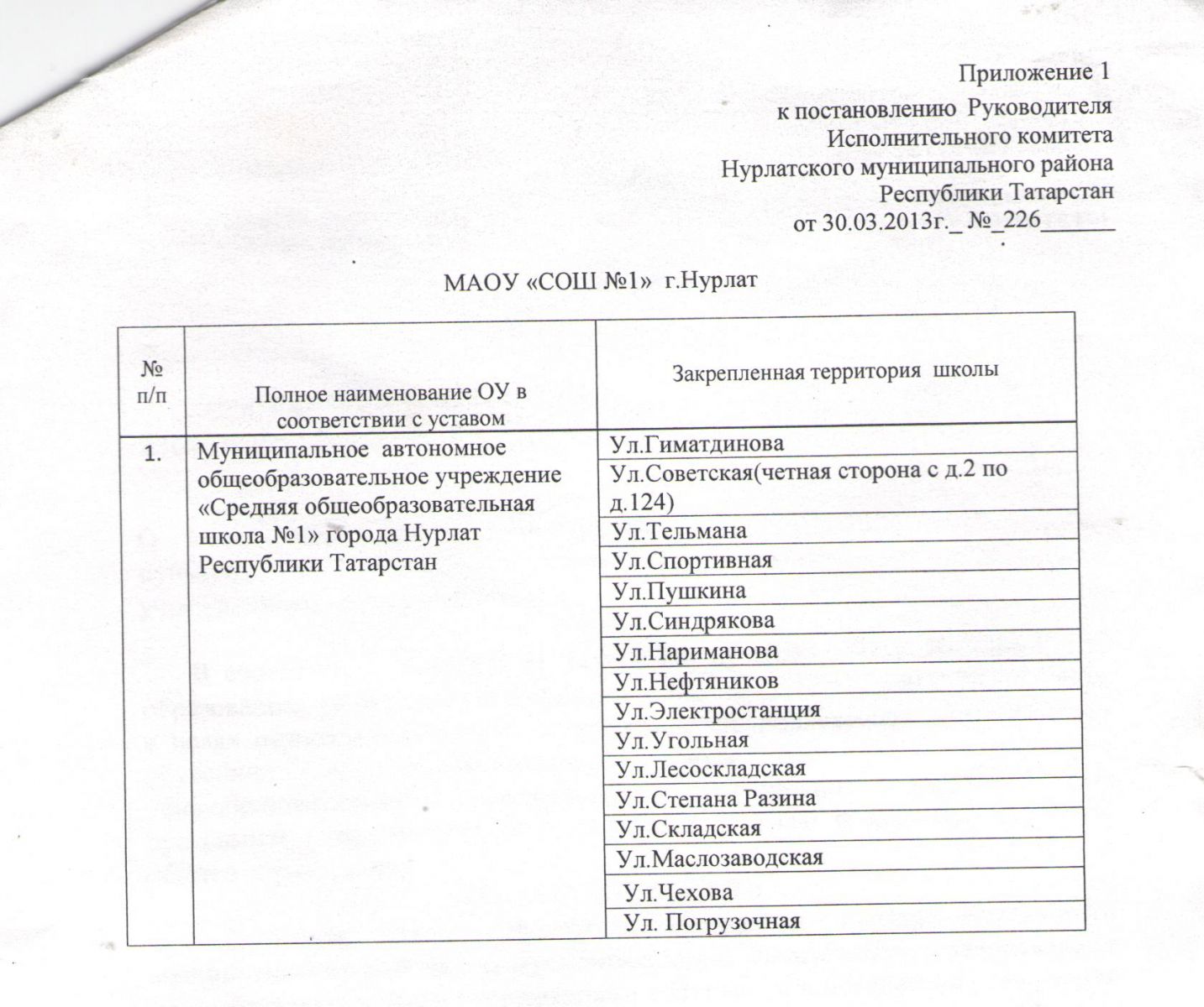 Постановление Исполнительного комитета Нурлатского муниципального района "О закреплении территорий за муниципальными образовательными учреждениями Нурлатского муниципального района РТ на 2022 год"