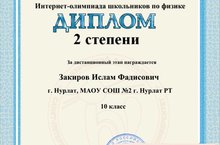 Санкт-Петербургский государственный университет ежегодно проводит международную предметную олимпиаду для школьников, которая входит в Перечень олимпиад РСОШ и дает льготы при поступлении в вузы страны. Ученик 10 класса Закиров Ислам прошел отборочный тур интернет-олимпиады школьников по физике, стал обладателем диплома 2 степени и приглашен на заключительный этап, который состоится в марте в режиме прокторинга (удаленного видеонаблюдения). Поздравляем Ислама с победой и желаем ему дальнейших успехов!