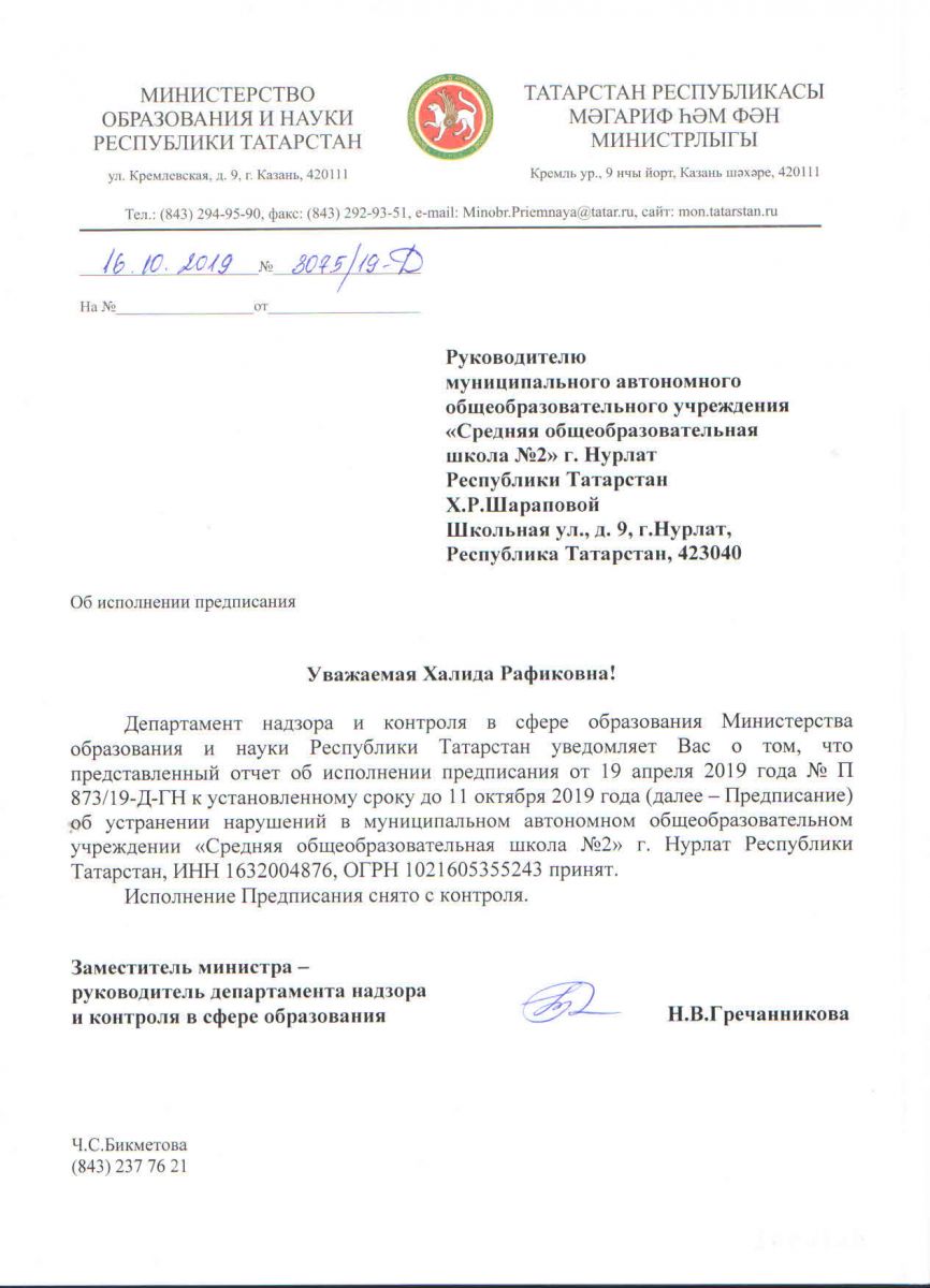 Об исполнении предписания от 19 апреля 2019 года № П 843/19-Д-ГН"./2019 елның 19 апрелендәге П-843/19-Д-Г номерлы күрсәтмәнең үтәлеше турында"