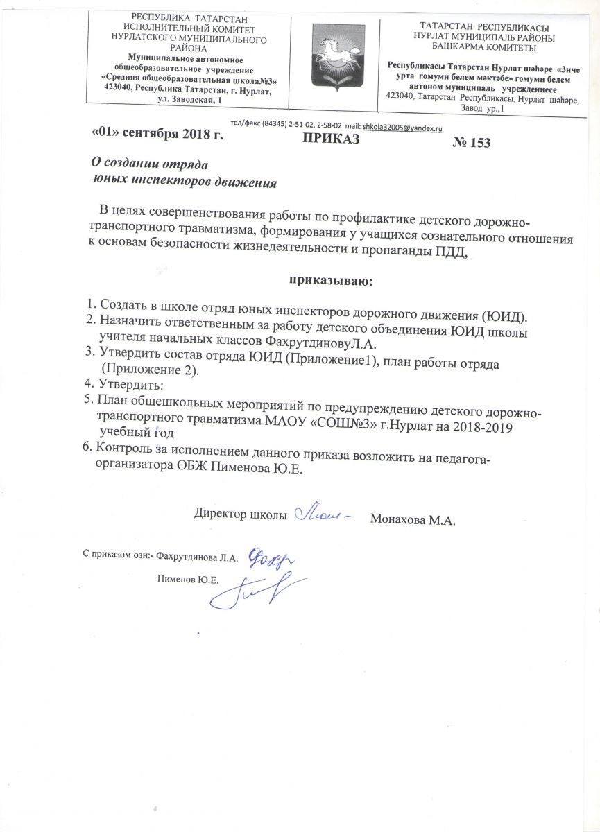 Приказ директора школы о создании отряда ЮИД/ ЮИД отрядын төзү турында мәктәп директоры боерыгы