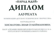Поздравляем Хисматову З.С. лауреата 2 степени республиканского конкурса антинаркотических профилактических видеороликов среди образовательных организаций дополнительного образования детей и объединения дополнительного образования детей на базе общеобразовательных организаций "Парад идей" в номинации "Детское техническое творчество" с видеороликом по направлению "Робототехника"