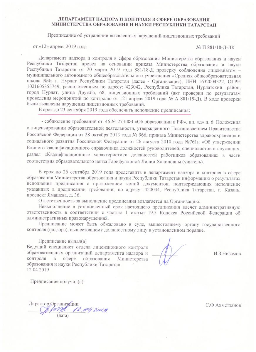 Муниципальное автономное общеобразовательное учреждение «Средняя общеобразовательная школа №4» г.Нурлат Республики Татарстан/Татарстан Республикасы Нурлат шәһәре " 4-нче урта гомуми белем мәктәбе" гомуми белем автоном муниципаль учреждениесе