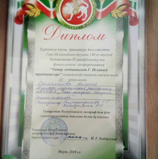 Г.Исхакыйның 140 еллыгына багышланган IV Республика фәнни-практик конференциясендә 10а сыйныфы укучысы Сөләйманова Алсинә 3нче дәрәҗәле Дипломга лаек булды.Фәнни җитәкчеләре: Гыйләҗетдинова Г.Г.,Хәбибуллина Р.Р.