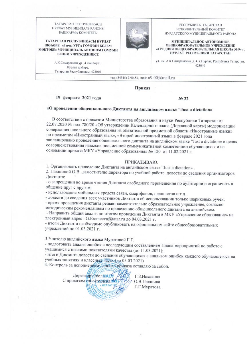 Анализ диктанта «Just a dictation” за 2020-2021 уч. год по МАОУ «СОШ№9» г. Нурлат РТ
