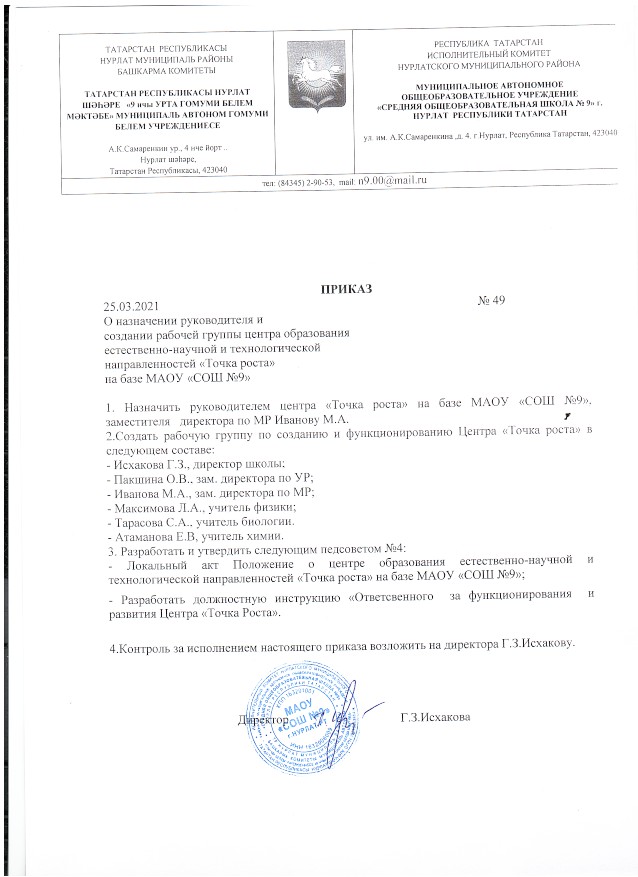 - Приказ о создании центра образования естественно-научной и технологической направленности "Точка роста"