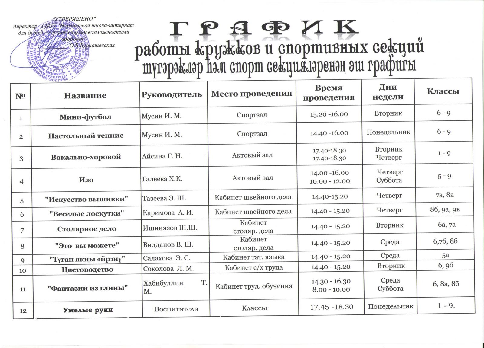 График работы кружков и спортивных секций на 2019-2020 учебный год